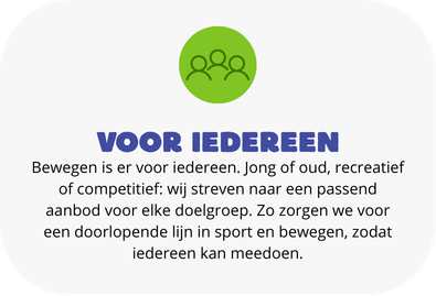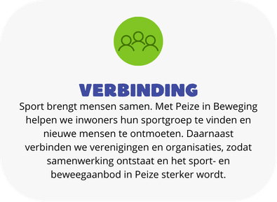 Wij brengen sport, gezondheid en vitaliteit samen voor iedereen in Peize. Van jong tot oud ondersteunen en verbinden wij initiatieven die mensen in beweging zetten. Samen creëren we een veelzijdig en toegankelijk bewegingsaanbod voor iedereen.
