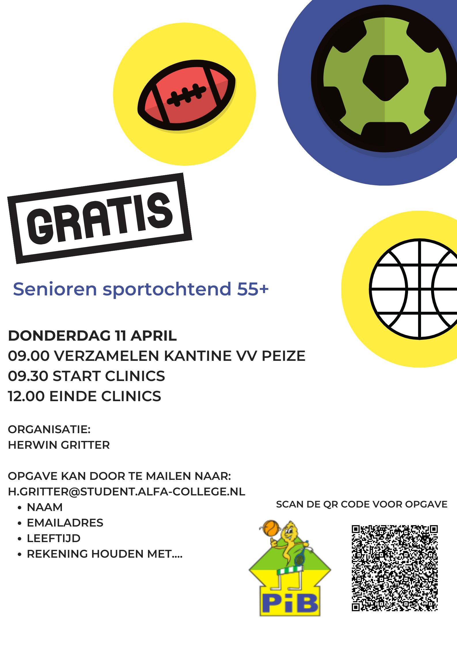 Donderdag 11 april organiseert student Herwin Gritter namens Peize in Beweging een sportochtend voor senioren. Na een lekkere kop koffie en een korte presentatie gaan we naar het veld om te sporten en te bewegen. Vervolgens gaan we naar binnen om daar twee sporten te beoefenen. Uiteraard sluiten we af met een bak koffie en … Read more