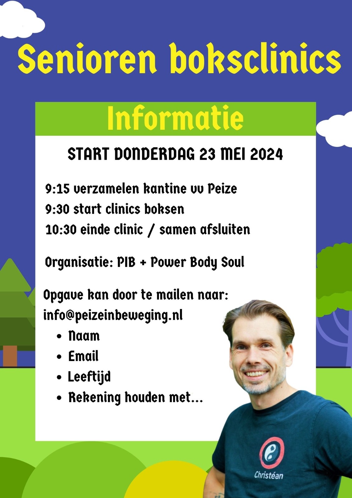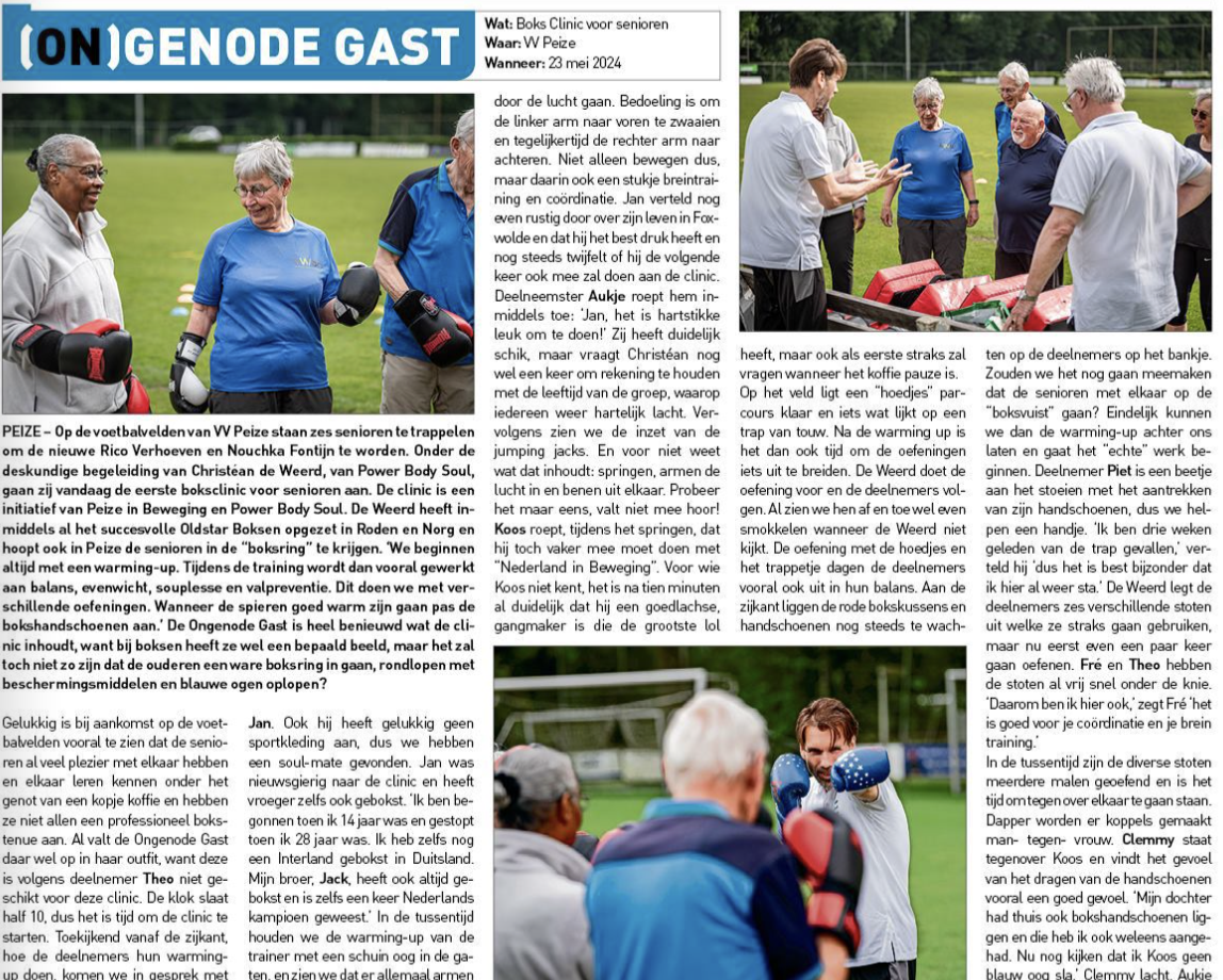 𝗦𝗲𝗻𝗶𝗼𝗿𝗲𝗻 𝗯𝗼𝗸𝘀𝗰𝗹𝗶𝗻𝗶𝗰𝘀 𝗶𝗻 𝗣𝗲𝗶𝘇𝗲 Na de geslaagde beweegochtend voor ouderen, onlangs georganiseerd door Herwin Gritter, gaan we verder met een vervolg hierop. In samenwerking met de Gemeente Noordenveld en Power Body Soul Christéan De Weerd gaan wij 5 boks clinics aanbieden voor de senioren doelgroep! Bekijk de poster en schrijf je in door te mailen … Read more