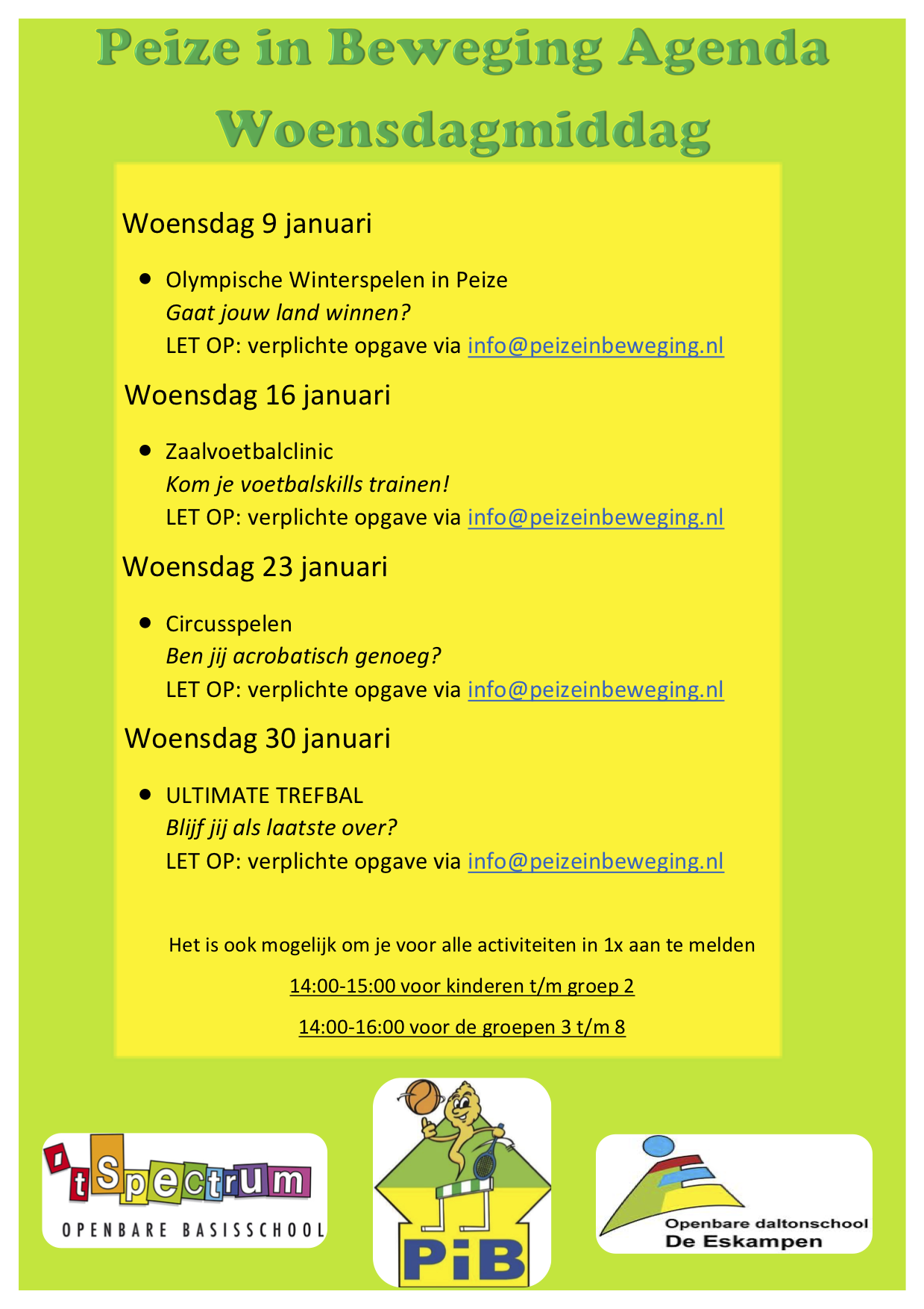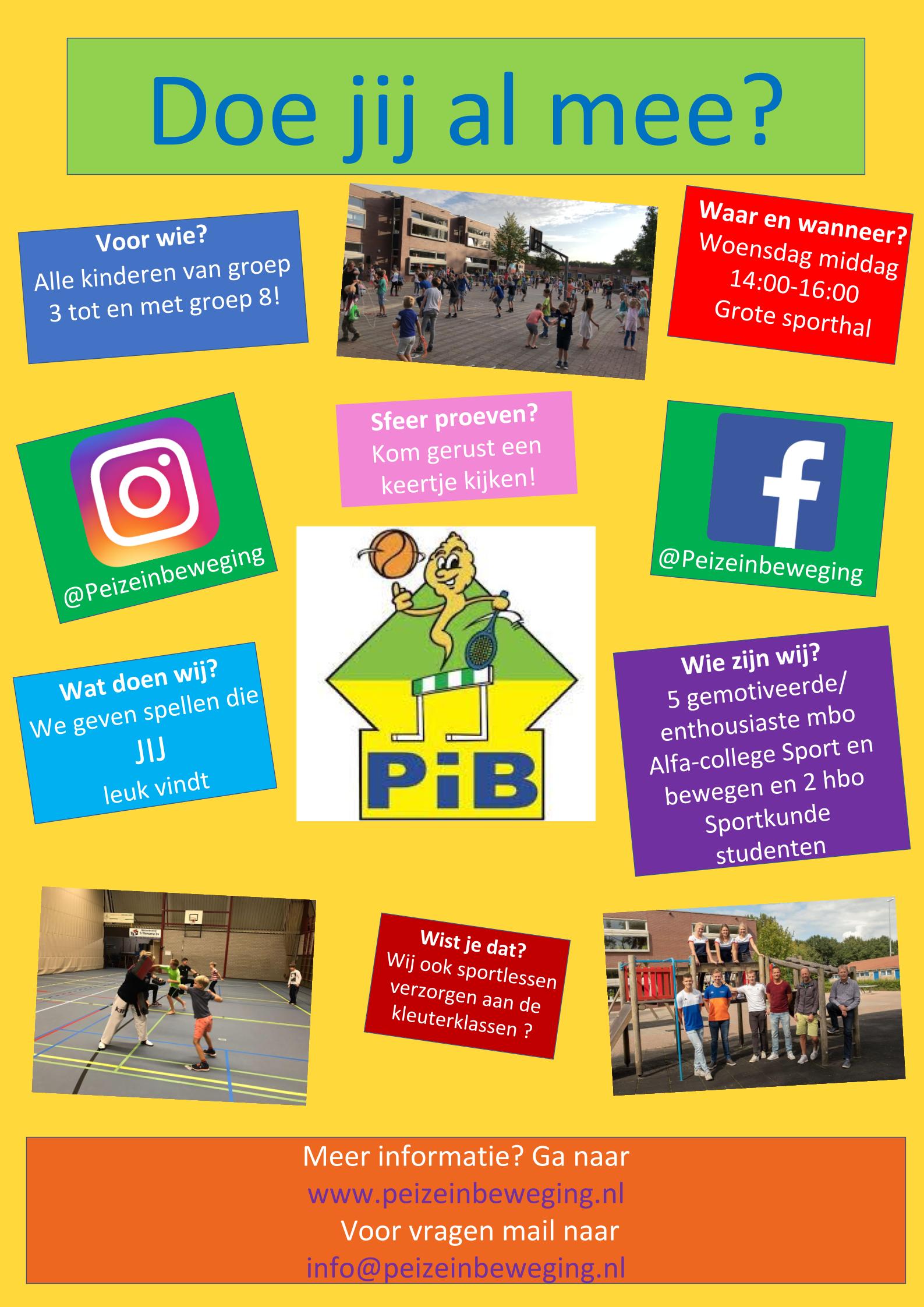 Aan alle kinderen van groep 3-8: kom naar de woensdagmiddag activiteiten! De studenten hebben iedere week weer super lessen voor jullie, en we hebben plek voor heel veel kinderen. Kom jij ook? We vinden het fijn als je dit even laat weten, mail naar: info@peizeinbeweging.nl Woensdag 17 oktober: Klimmen & Klauteren | Badminton | Trefbalspelen