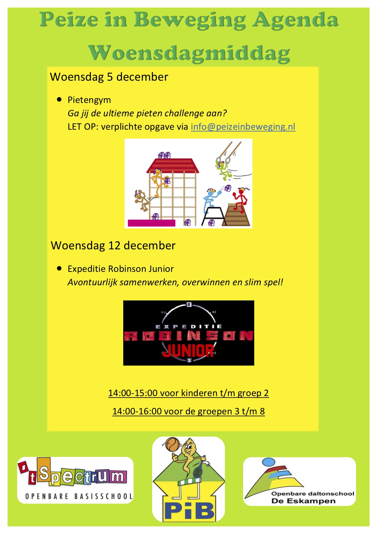 De woensdagmiddag activiteiten in 2018 gaan nog door tot 12 december, nog 2 activiteiten. Uiteraard weer voor alle leeftijden, zoals iedere woensdag. Let op: voor 5 december echt inschrijven via de email: info@peizeinbeweging.nl Deelname is gratis! Sint moet namelijk wel even weten hoeveel kinderen er komen, dan kan hij gericht inkopen!! Doe je pietenpak aan, … Read more