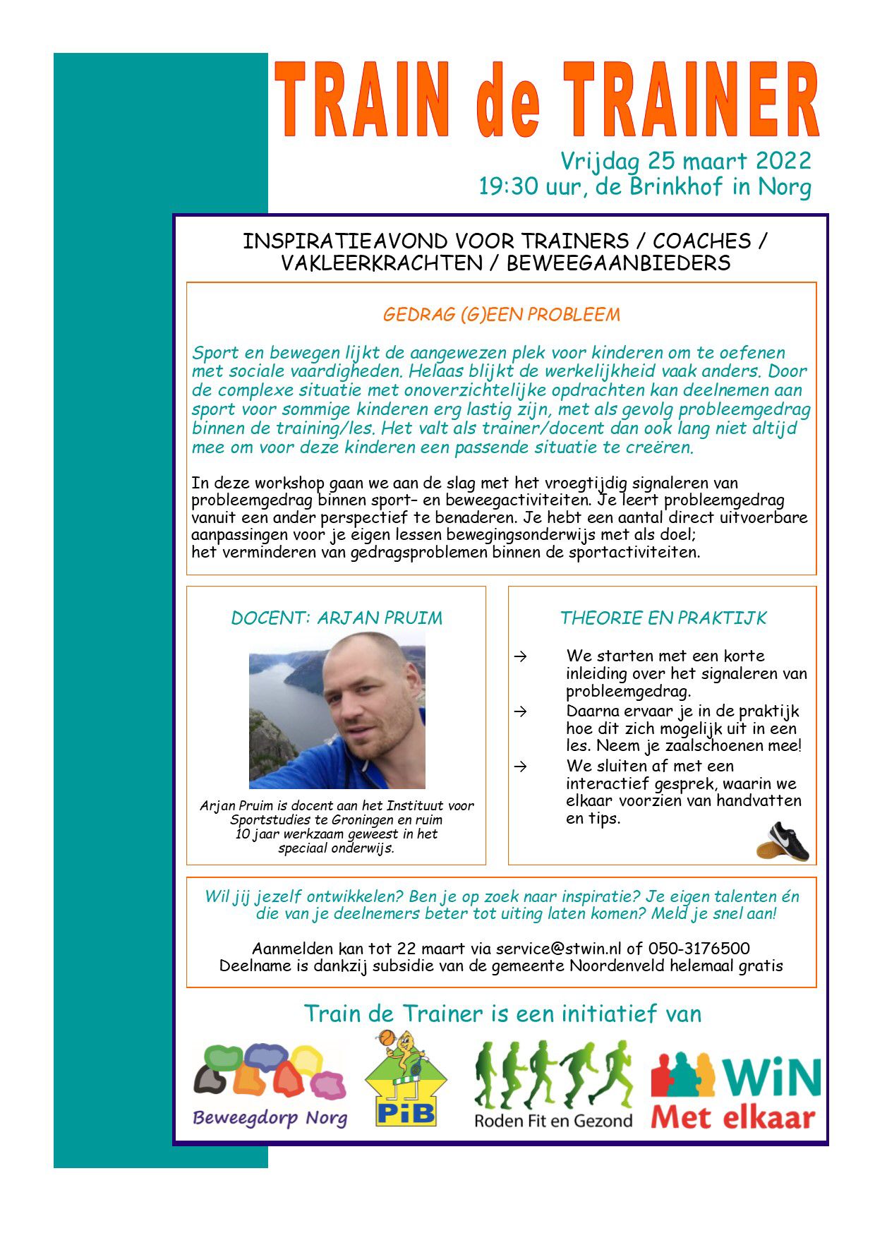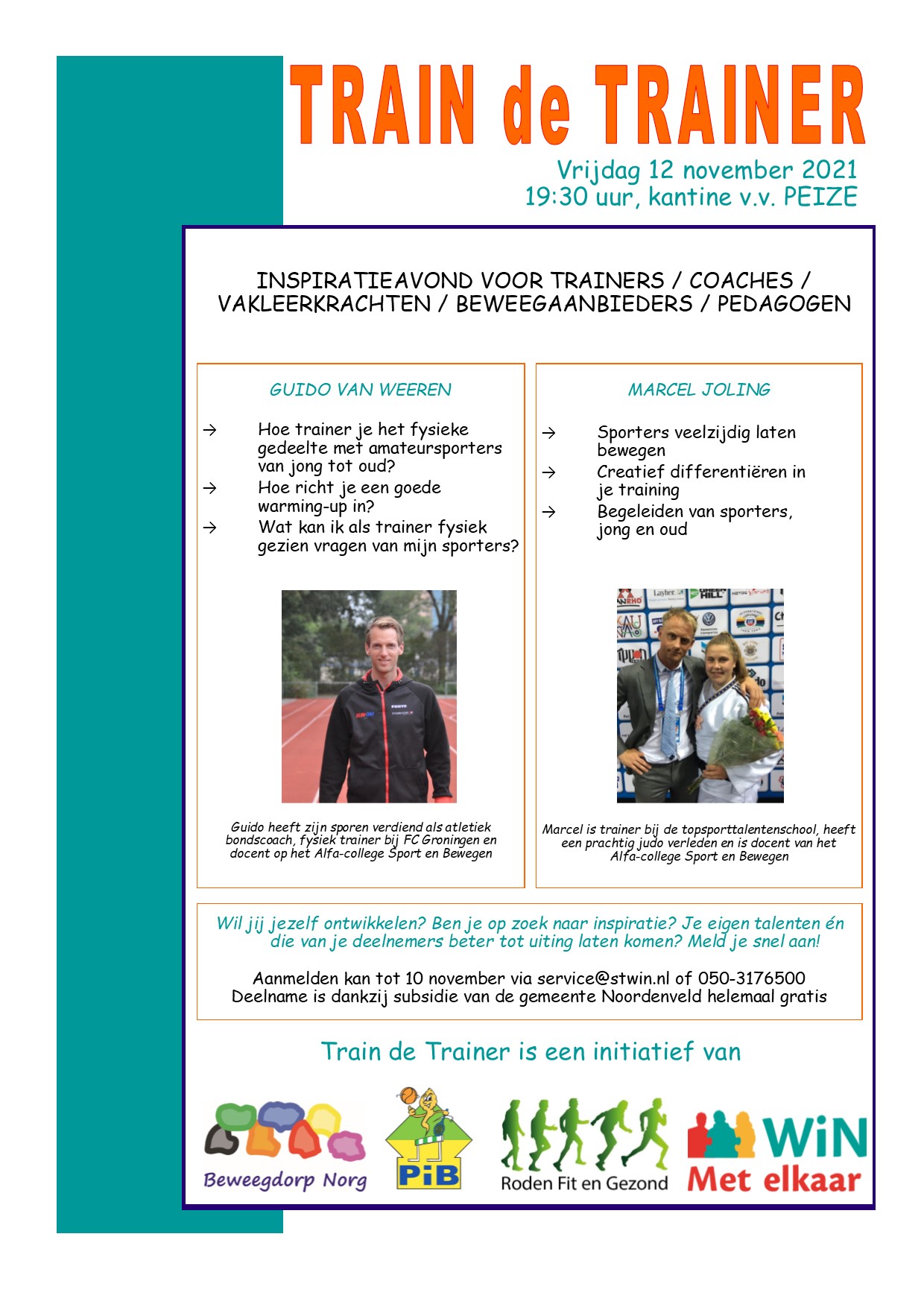 Vrijdag 12 november om 19.30 zal de aftrap zijn van de eerste Train de trainer avond bij vv Peize. Dit is een Noordenveld breed initiatief van: Beweegdorp Norg, Roden Fit & Gezond, Welzijn in Noordenveld en Peize in Beweging. Trainers, docenten, coaches, instructeurs, pedagogen, opvoeders zijn allemaal welkom op deze mooie inspiratie avond. Marcel Joling … Read more